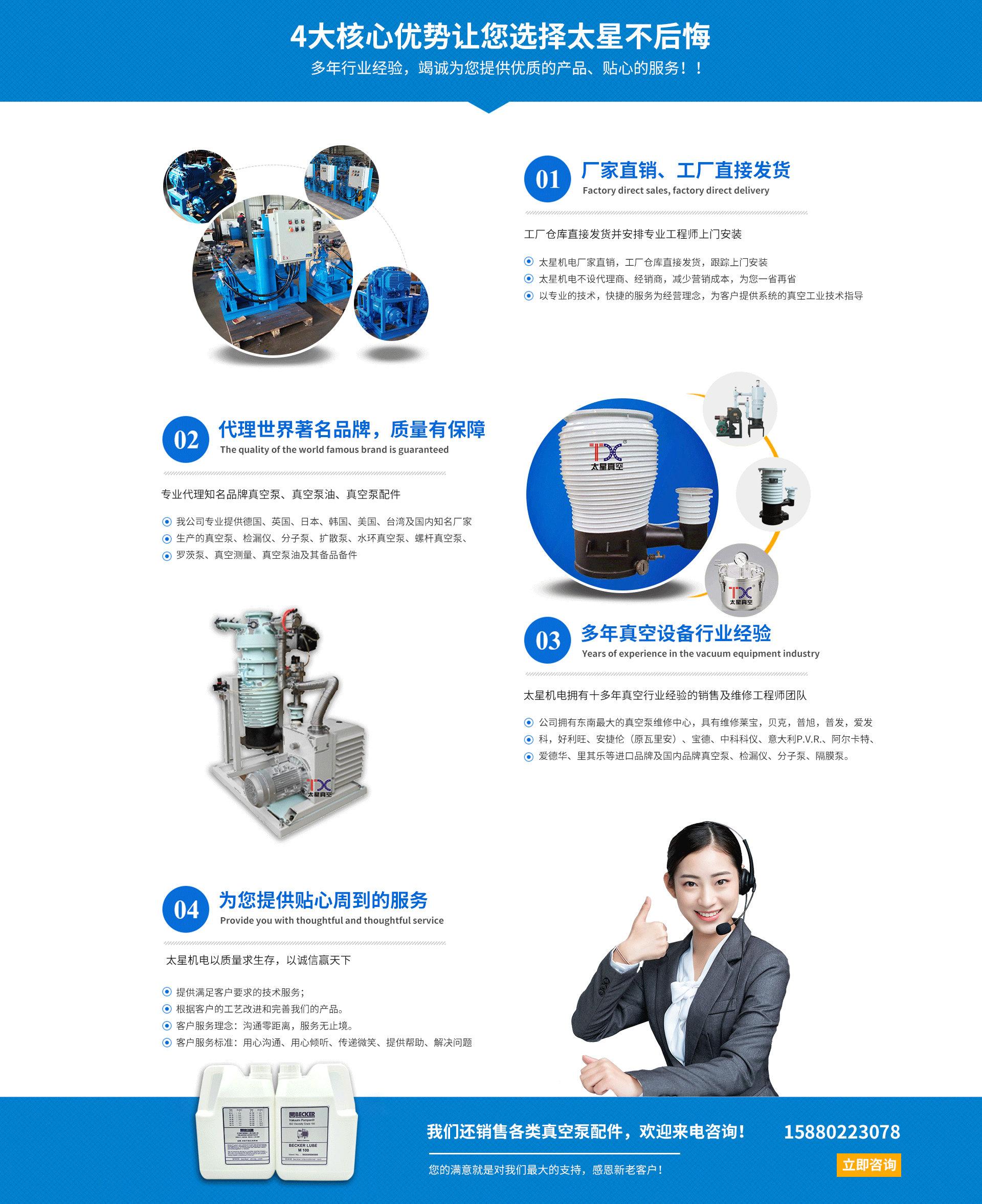 廈門太星機電有限公司于2009年成立于廈門集美,是一家真空工業(yè)服務(wù)企業(yè)。廈門太星機電有限公司擁有一批技術(shù)維修團隊,在維修方面有精湛、豐富的技術(shù)經(jīng)驗,標準的維修車間,標準的維修工具,規(guī)范的作業(yè)流程。為客戶提供完善可靠的服務(wù),以精致維修,價格合理,提升真空設(shè)備的使用價值。 廈門太星機電有限公司真空工業(yè)銷售和服務(wù)。以技術(shù)雄厚的服務(wù)能力廣受客戶的認可,應用于上百家客戶,提供了優(yōu)良的服務(wù),應客戶需求定制價值高的真空工業(yè)解決方案。 主營范圍: 1、銷售真空泵、真空配件、真空泵油、耗材、真空部件; 維修保養(yǎng)干泵、分子泵、旋片泵、機械泵、羅茨泵、渦旋泵、氦質(zhì)譜檢漏儀、羅茨風機、隔膜泵、柱塞泵、水環(huán)泵、真空儀器、真空閥門等真空設(shè)備; 真空系統(tǒng)的定制、優(yōu)化、改造、升級。 真空系統(tǒng)檢漏服務(wù); 非標真空工程的規(guī)劃、設(shè)計、施工、調(diào)試、培訓服務(wù); 3D打印機及3D打印服務(wù); 2、進口真空泵的銷售、維修和保養(yǎng)的一條龍服務(wù),如Agilent安...